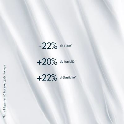 Après seulement 4 semaines, la peau bénéficie de : -22% de rides* +20% tonicité* +20% élasticité* Résultats de test : – 96% des hommes affirment que leur peau paraît plus ferme** – 94% des hommes affirment que la texture de leur peau semble affinée** – 92% des hommes affirment que leurs rides sont visiblement lissées** *Résultats d’une étude clinique sur 50 hommes après 7 jours **Auto-évaluations de 50 hommes après 56 jours